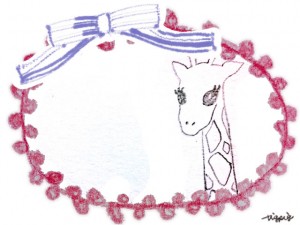 フリー素材:北欧風のシンプルなポンポンレースとストライプのリボンの飾り枠と大人可愛いキリンのイラスト;640×480pix