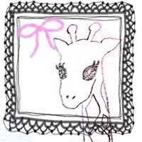 フリー素材:アイコン(twitter,mixi,ブログ);ガーリーなモノクロのレースの飾り枠とピンクのりぼんとキリンの鉛筆イラスト;200×200pix