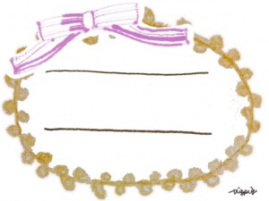 ガーリーなピンクのリボンと芥子色のポンポン付きレースの楕円のラベルシールみたいな囲み枠
