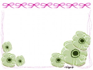 ガーリーなピンクのリボンと薄緑のアネモネの北欧風イラストの飾り枠
