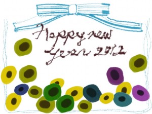 北欧風の花とhappynewyear2012の手書き文字とパステルブルーのストライプのリボン