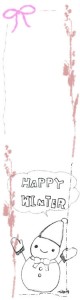 北欧風のピンクの木の枝とりぼんと雪だるまとHAPPYWINTERの手書き文字と吹出し