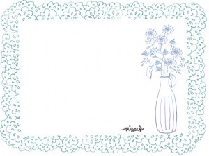 フリー素材:フレーム;北欧風の花瓶とシンプルな花とパステルブルーのレースの囲み枠:640×480pix