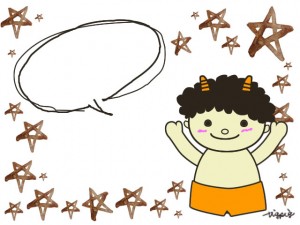 モノクロのラフなラインの吹出しと水彩の星と鬼のイラスト