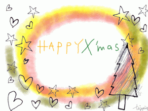 手書きの星とハートとクリスマスツリーと水彩風のにじみとHAPPY X’masの手書き文字のフレーム。