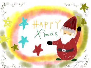クリスマスのフリー素材:ポップなサンタクロースと星と薔薇とHAPPYX’masの手書き文字;640×480pix