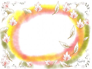 ガーリーな紅葉のイラストとカラフルなにじみのフレームのフリー素材;640×480pix