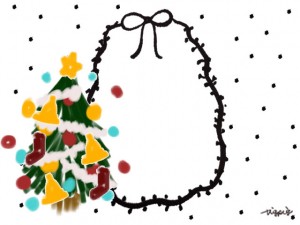 ポップなクリスマスツリーのイラストとモノトーンのリボンとドットのフレームのフリー素材