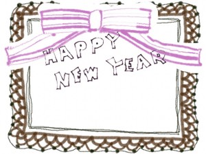 ポップなHAPPY NEW YEAR の手書き文字とブラウンのレースとピンクのリボンのフリー素材:640×480pix