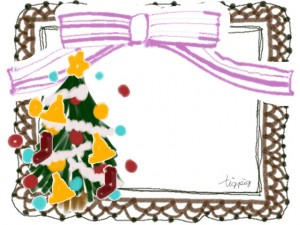 ポップなクリスマスツリーとブラウンのレースとピンクのリボンの枠のフリー素材:640×480pix