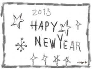 2013 HAPPY NEW YEAR の手書き文字と星とキラキラのフレームのモノトーンのフリー素材