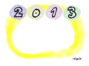 2013の手書き文字と黄色の水彩風のにじみのフレームのフリー素材:640×480pix