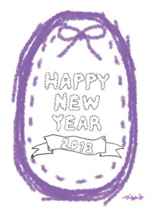 もこもこの手書き文字HAPPY NEW YEAR 2013 とリボンとステッチの紫のラベル:480×640pix