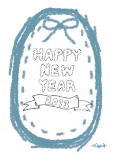 HAPPY NEW YEAR 2013 のもこもこの手書き文字とブルーのリボンとステッチのラベル:480×640pix