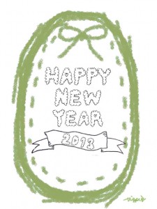もこもこの手書き文字HAPPY NEW YEAR とリボンの2013と抹茶グリーンのラベル:480×640pix
