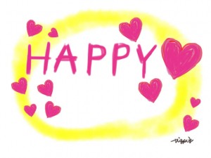 HAPPYの手書き文字とハートいっぱいの水彩のにじみ