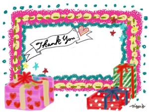 プレゼントボックスとポップなフレームとThank Youの手書き文字のリボンの見出し:640×480pix