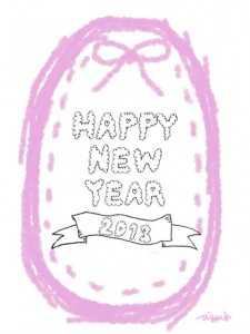 もこもこのHAPPY NEW YEAR 2013の手書き文字とピンクのリボンとステッチのラベル:480×640pix