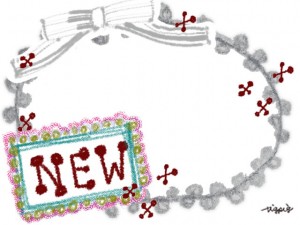 大人可愛いグレーのリボンとピコットレースとNEWの手書き文字のラベルのフリー素材;640×480pix