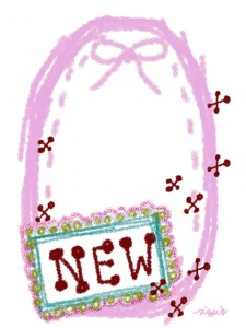 「NEW」の手書き文字とピンクのリボンとラフなラインのラベル風フレームのフリー素材:480×640pix