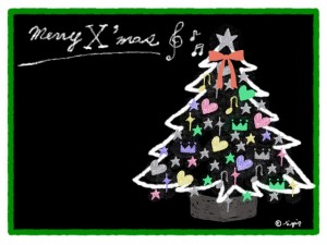 Merry X’masの手書き文字とカラフルなオーナメントのクリスマスツリーのフリー素材:640×480pix