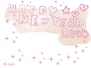 HAPPY NEW YEAR 2014の手描き文字とハートと星とキラキラのフレーム(ピンクver.):640×480pix