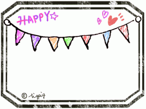 HAPPYの手描き文字とカラフルな旗とアンティーク風ラベルのフレーム:640×480pix