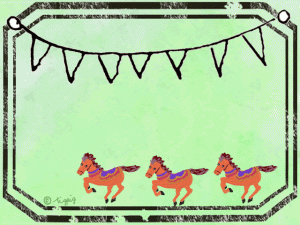 パステルグリーンのにじみの背景と旗とメルヘンな馬(三頭)のイラストとフレーム:640×480pix