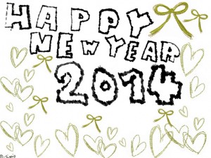 HAPPY NEW YEAR 2014の手描き文字とゴールドのリボンとハートいっぱいのフレーム:640×480pix