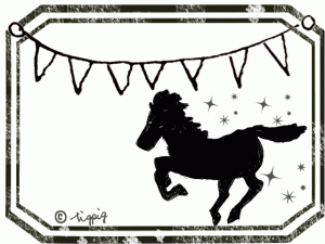 かわいい馬のイラストのシルエットとラベル風フレームと旗のフリー素材:640×480pix