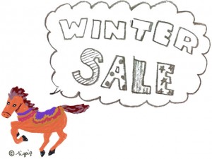 大人かわいい馬のイラストと「WINTER SALE」の手書き文字とふきだし:640×480pix