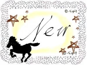 大人可愛いNEWの手書き文字と馬のシルエットと星とアンティーク風ラベルのイラスト無料素材:640×480pix