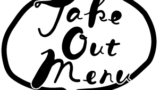 【menu】Take out menu(お持ち帰り)の筆記体の手書き文字と小花とストライプの丸の背景のラベル風webデザイン素材