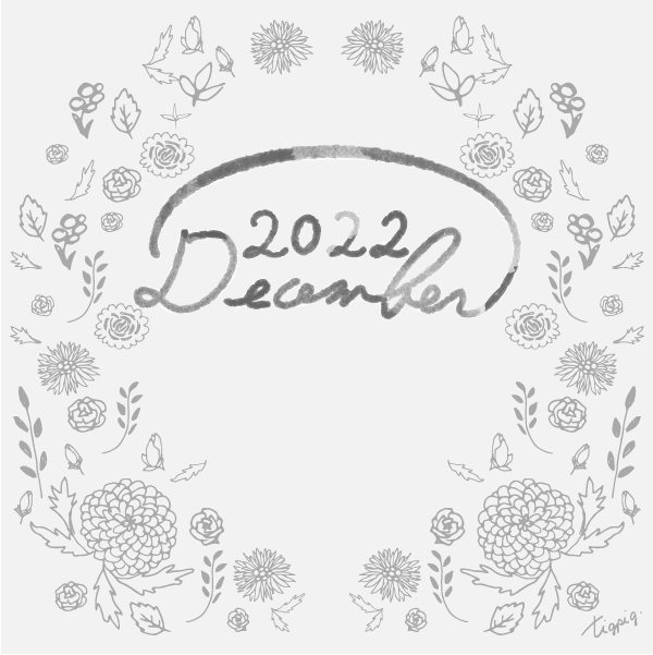 【12月】December2022の手書き文字とヨーロッパ風の花と葉っぱのイラストバナー素材600×600pix