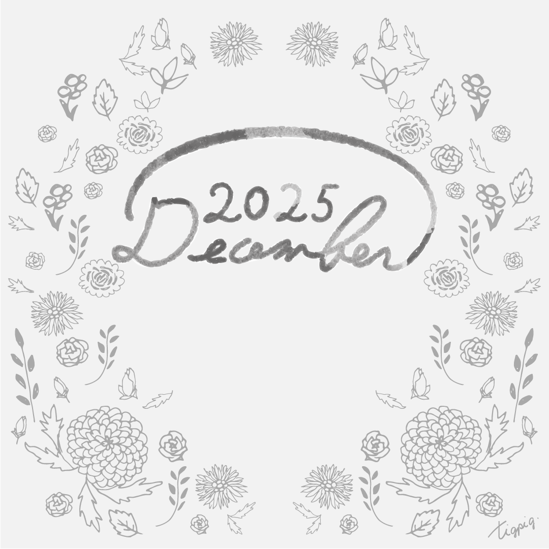 【12月】December2025の手書き文字とヨーロッパ風の花と葉っぱのイラストバナー素材1080×1080pix