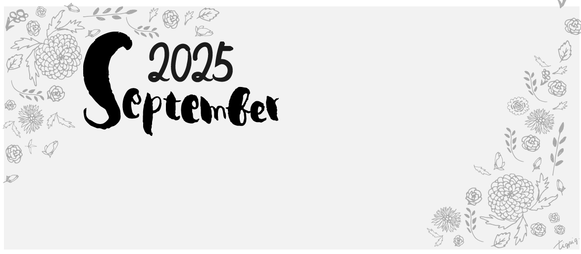【9月】September2025の手書き文字とヨーロッパ風の花と葉っぱのイラストのヘッダー素材 1280×720pix