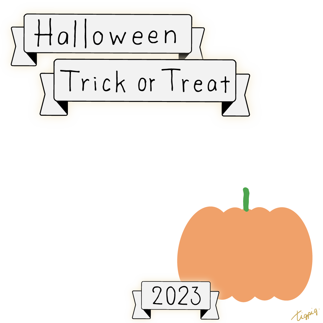 [Instagramサイズ]Halloween Happy Trick or Treat 2023のレトロな手描き文字とかぼちゃのイラストとリボンのあしらいのバナー素材1080×1080pix(デザイン.01 透過)