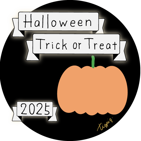 [ハロウィン]Halloween Happy Trick or Treat 2025のレトロな手描き文字とかぼちゃのイラストとリボンのあしらいのバナー素材600×600pix(デザイン.3)