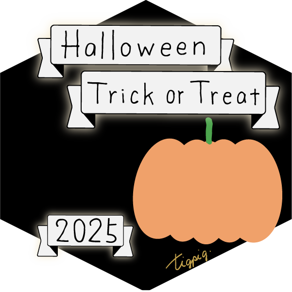 [ハロウィン]Halloween Happy Trick or Treat 2025のレトロな手描き文字とかぼちゃのイラストとリボンのあしらいのバナー素材600×600pix(デザイン.6)