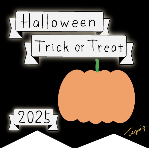 [ハロウィン]Halloween Happy Trick or Treat 2025のレトロな手描き文字とかぼちゃのイラストとリボンのあしらいのバナー素材600×600pix(デザイン.8)