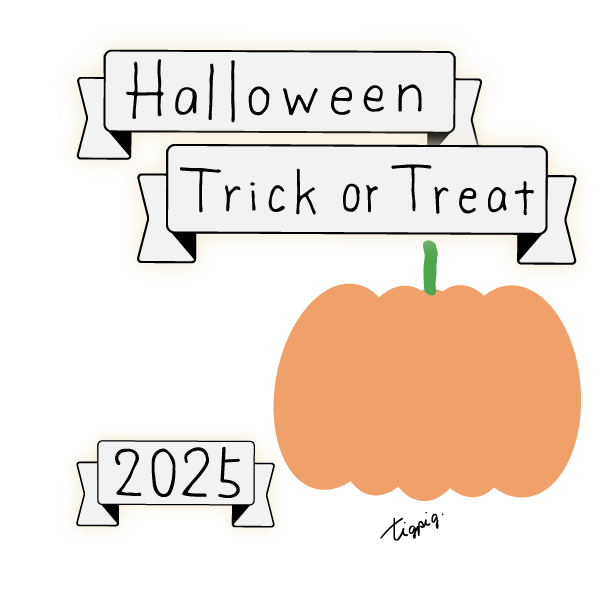 [ハロウィン]Halloween Happy Trick or Treat 2025のレトロな手描き文字とかぼちゃのイラストとリボンのあしらいのバナー素材600×600pix(デザイン.14)