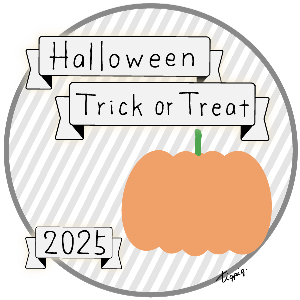 [ハロウィン]Halloween Happy Trick or Treat 2025のレトロな手描き文字とかぼちゃのイラストとリボンのあしらいのバナー素材600×600pix(デザイン.178)