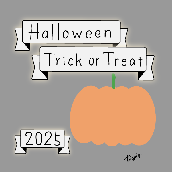 [ハロウィン]Halloween Happy Trick or Treat 2025のレトロな手描き文字とかぼちゃのイラストとリボンのあしらいのバナー素材600×600pix(デザイン.27)