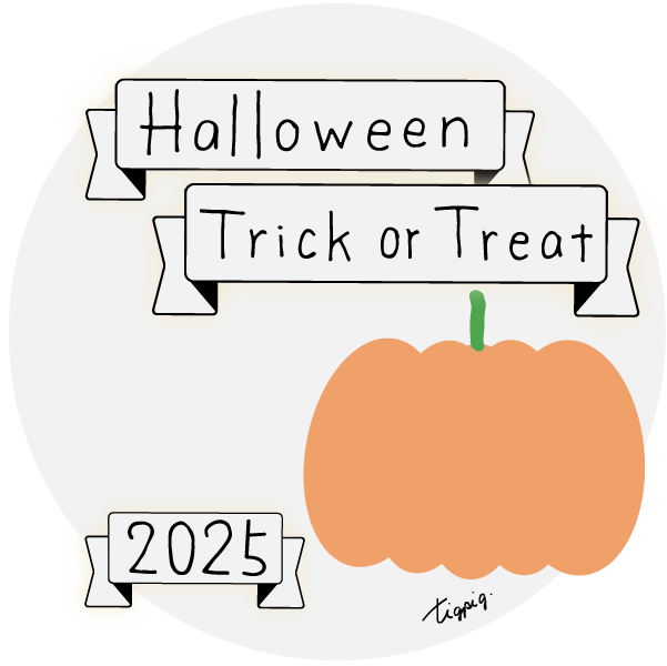 [ハロウィン]Halloween Happy Trick or Treat 2025のレトロな手描き文字とかぼちゃのイラストとリボンのあしらいのバナー素材600×600pix(デザイン.30)