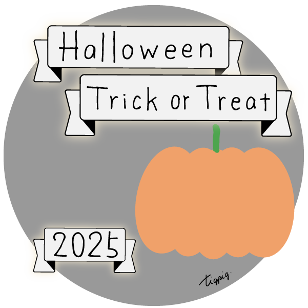 [ハロウィン]Halloween Happy Trick or Treat 2025のレトロな手描き文字とかぼちゃのイラストとリボンのあしらいのバナー素材600×600pix(デザイン.33)
