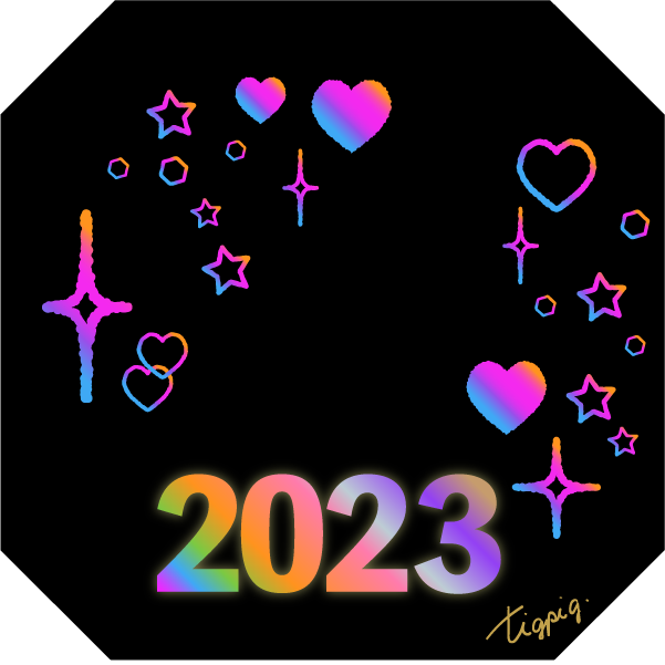 虹色のグラデーションのハートと星とキラキラ[2023]のバナー素材600×600pix(デザイン.5)