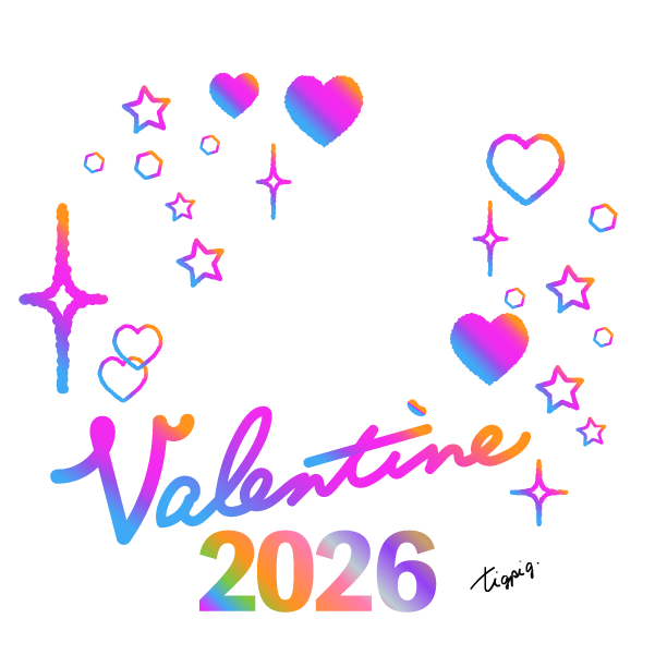 虹色のグラデーションのValentine 2026の手書き文字とキラキラのあしらいのバナー素材600×600pix(デザイン.10)