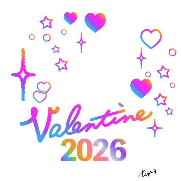 虹色のグラデーションのValentine 2026の手書き文字とキラキラのあしらいのバナー素材600×600pix(デザイン.12)