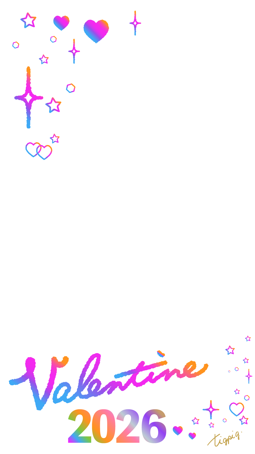 虹色のグラデーションのValentine 2026の手書き文字とキラキラのあしらいのバナー素材です。TikTokサイズの背景デザインに使える1080×1920pixのバナー素材です。HP制作、オンラインショップなどのwebデザインにもご利用いただけます。(商用、印刷、掲示、配布可。販売不可。) イベントやセールのタイポグラフィーやその他イラスト、商品画像などと組み合わせてご利用ください。