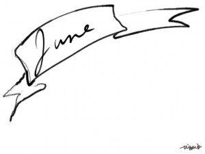 webデザイン、バナー広告、ネットショップのフリー素材:大人可愛いモノクロのJune(6月)の手書き文字とガーリーなリボンのフレーム(640×480pix)